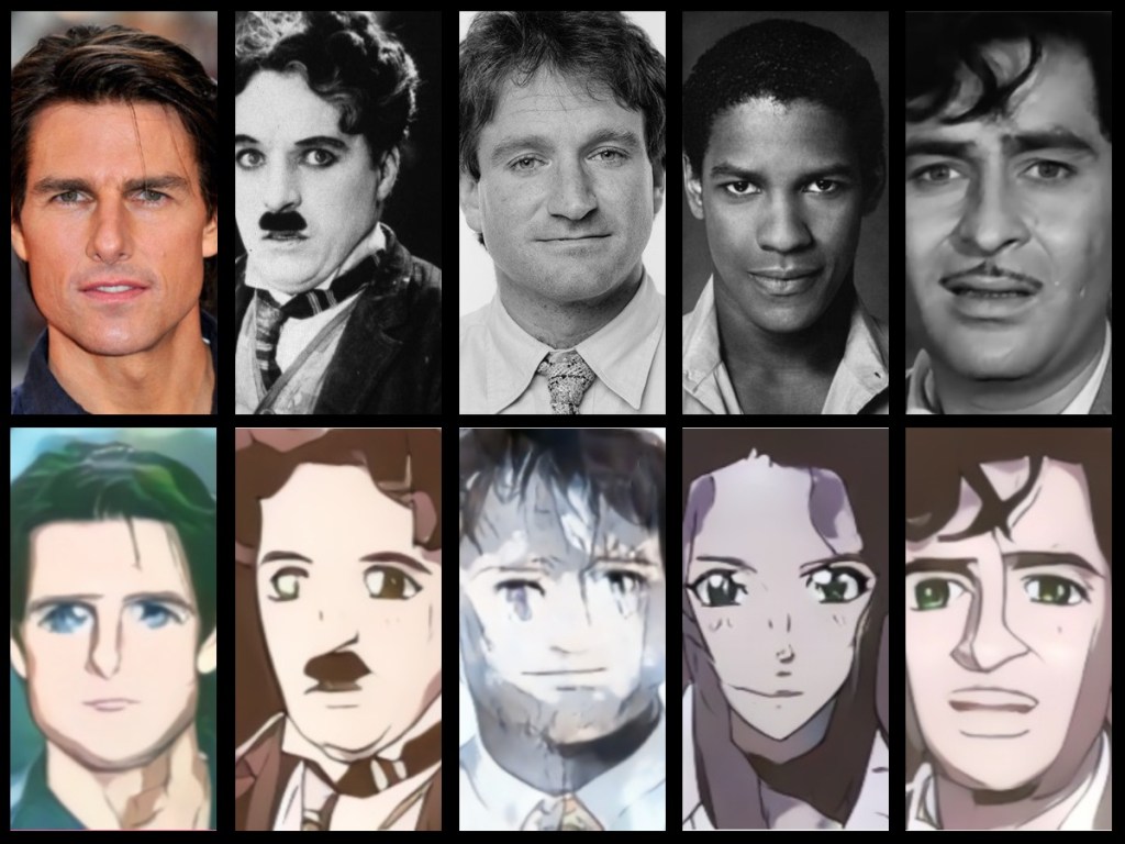 Here, I first converted still pictures of famous actors into Anime Characters like this: